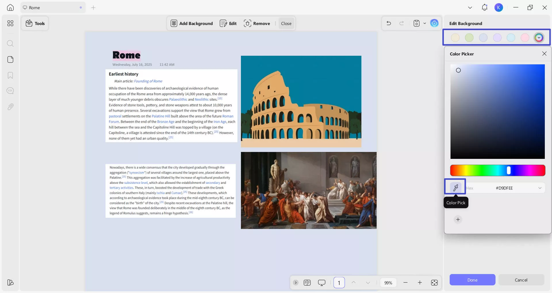 From the right panel, you can choose a color to edit the background color. If you want to find more colors, simply click the dropdown button on the color section. A color picker panel will appear. It consists of a gradient bar from dark to light, a rainbow spectrum, a hexadecimal color code input box, and a "Color Pick" button for color selection. The "Color Pick" button enables you to pick a color from the document.