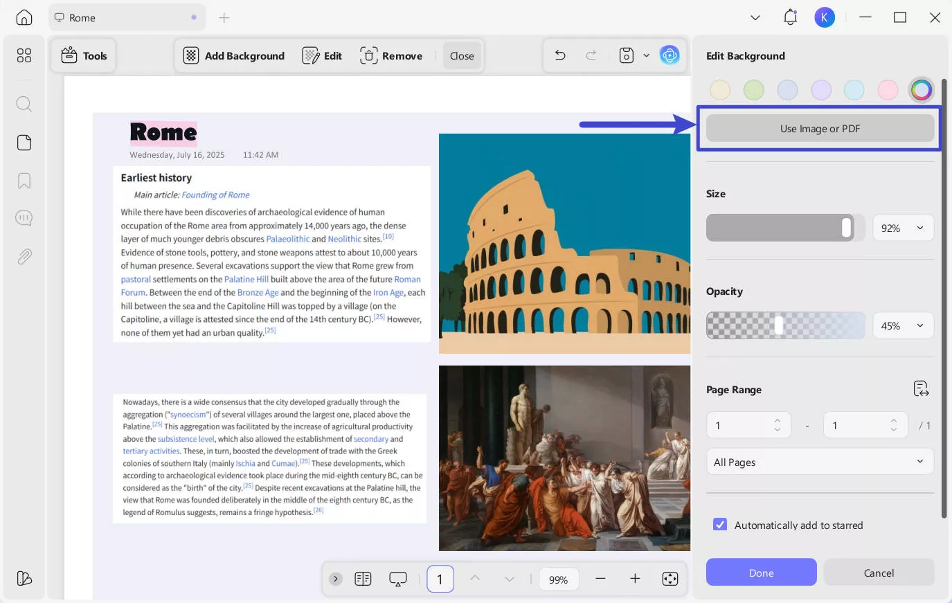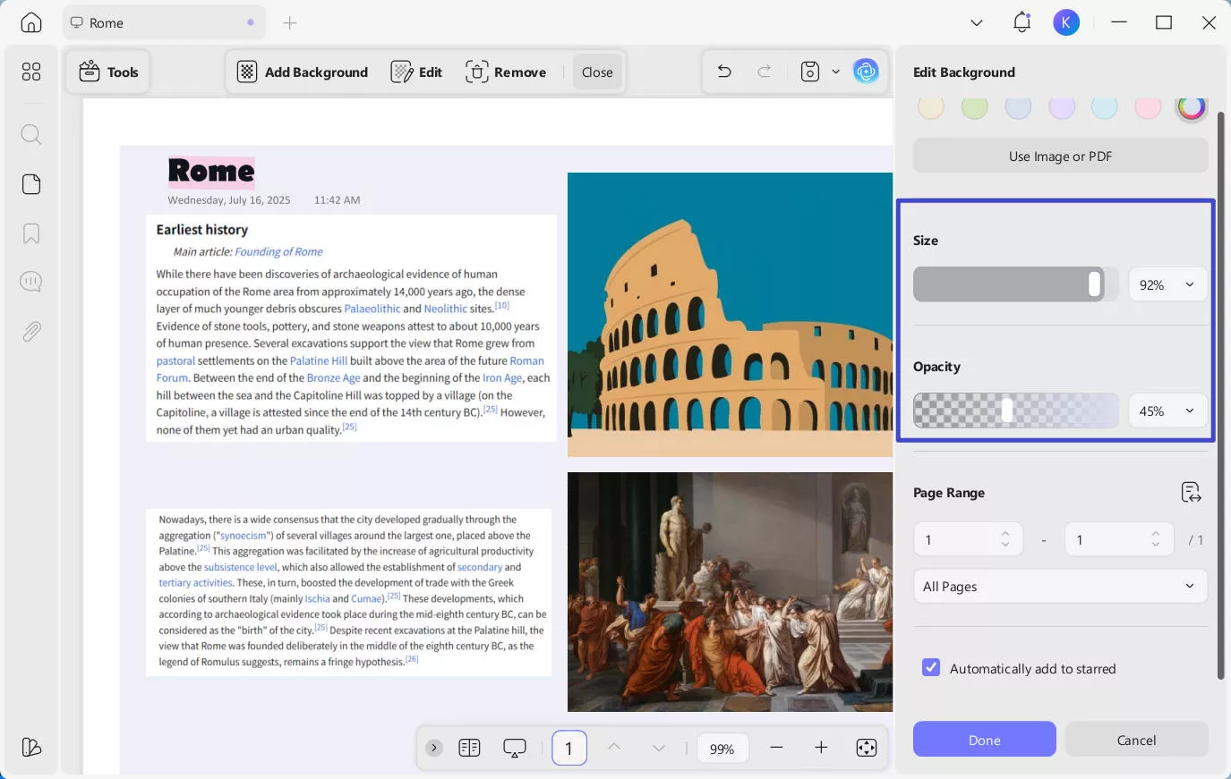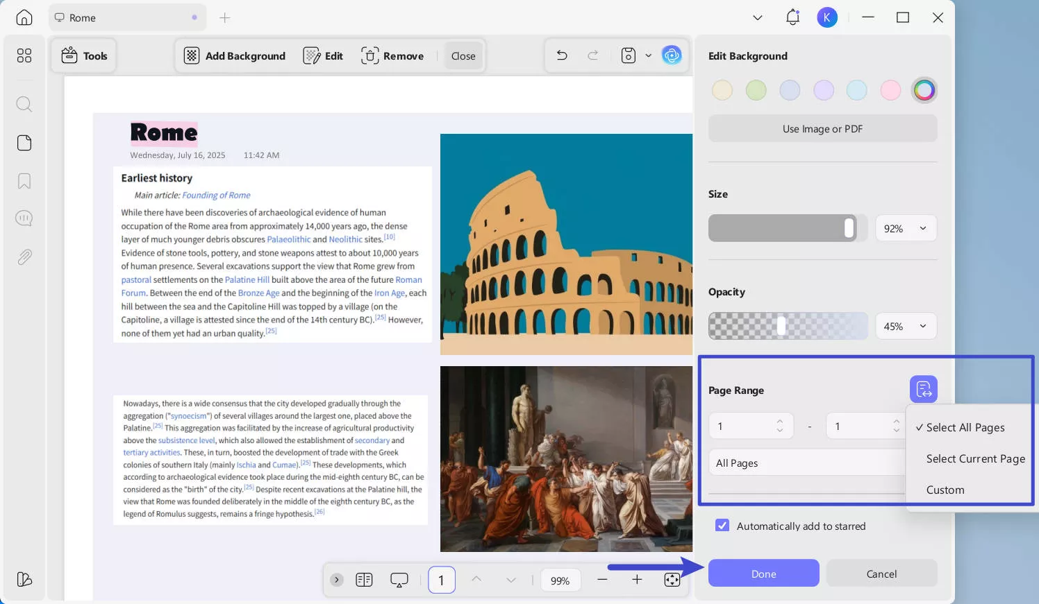 After completing the background editing and settings, if you are satisfied with the settings, click the "Done" button to save the background settings and apply them to the document. Meanwhile, you can check the "Automatically add to starred" option.