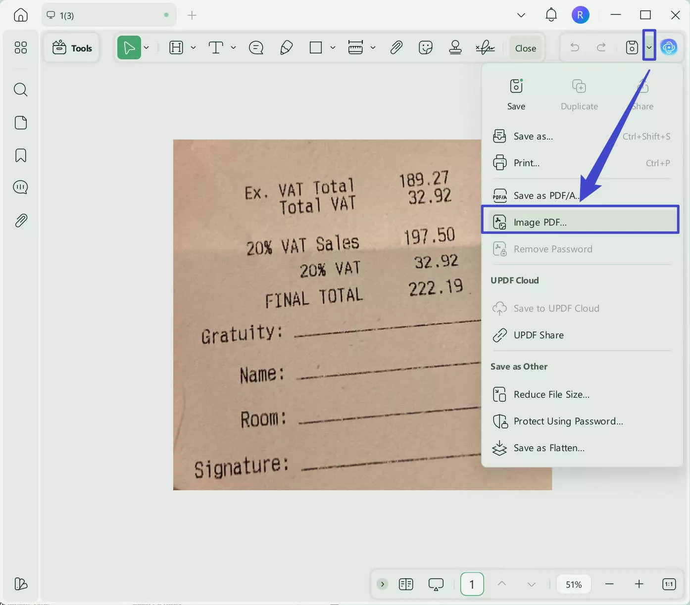 Again, choose the "Image PDF" tool after clicking on the "arrow down" icon.