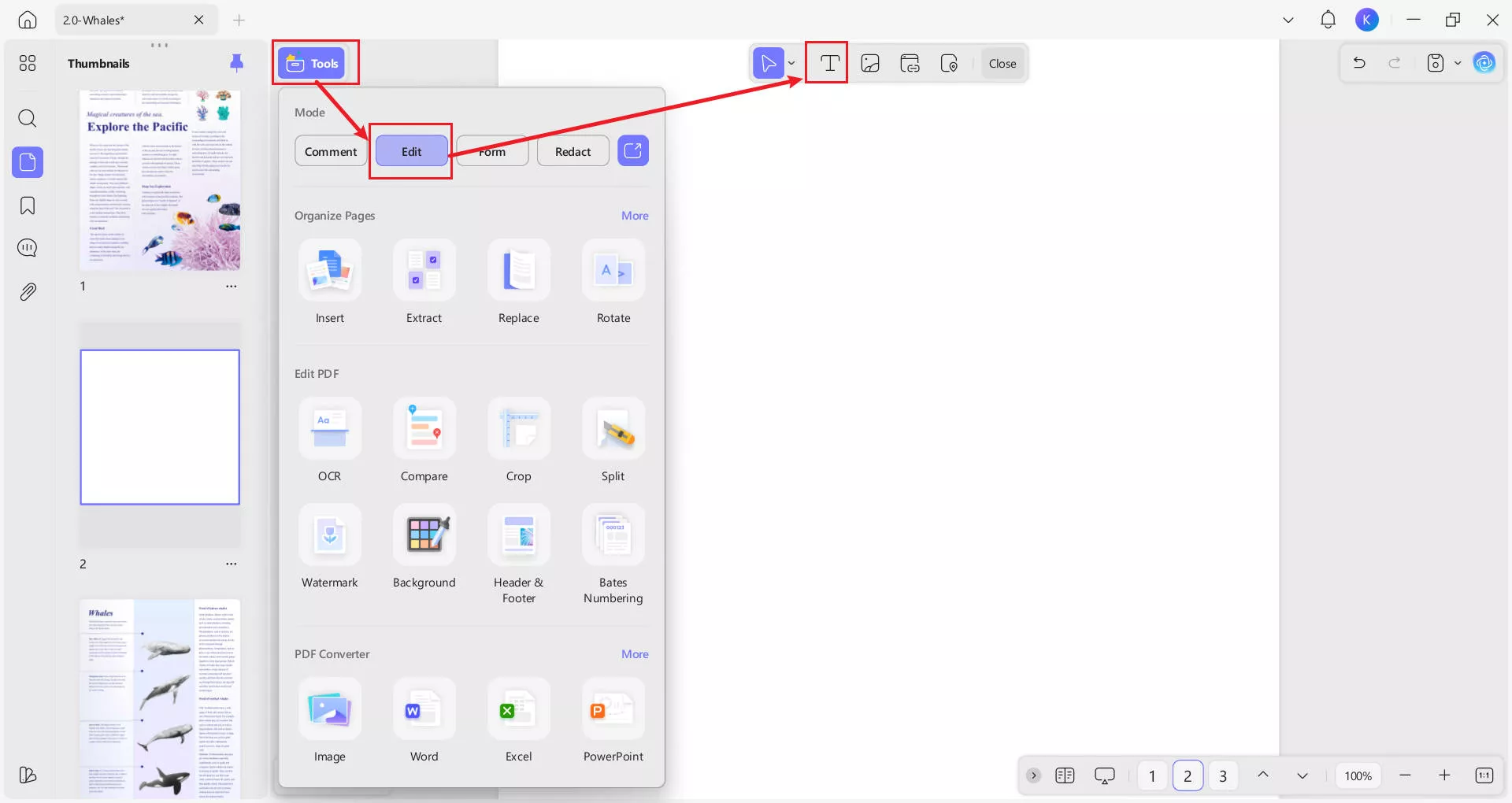 Step 3. Open the text editing tools: Go to Edit PDF, then choose Text on the top menu.