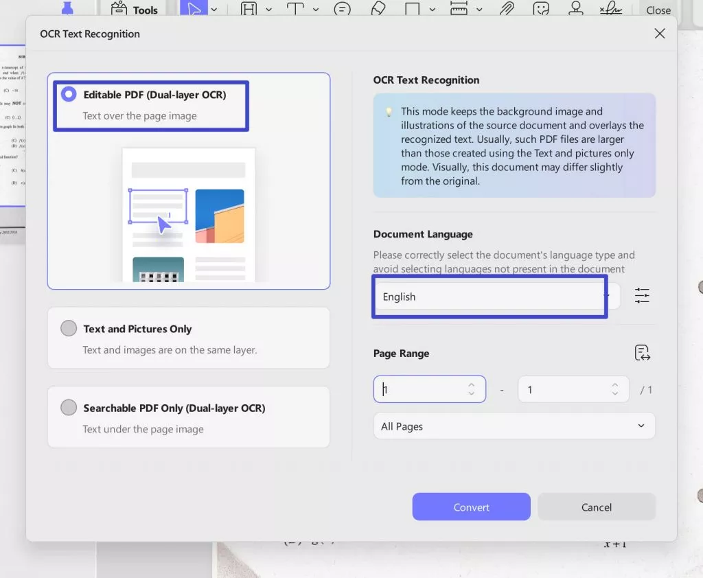 • Once the OCR popup, select Editable PDF and choose the language on the image.