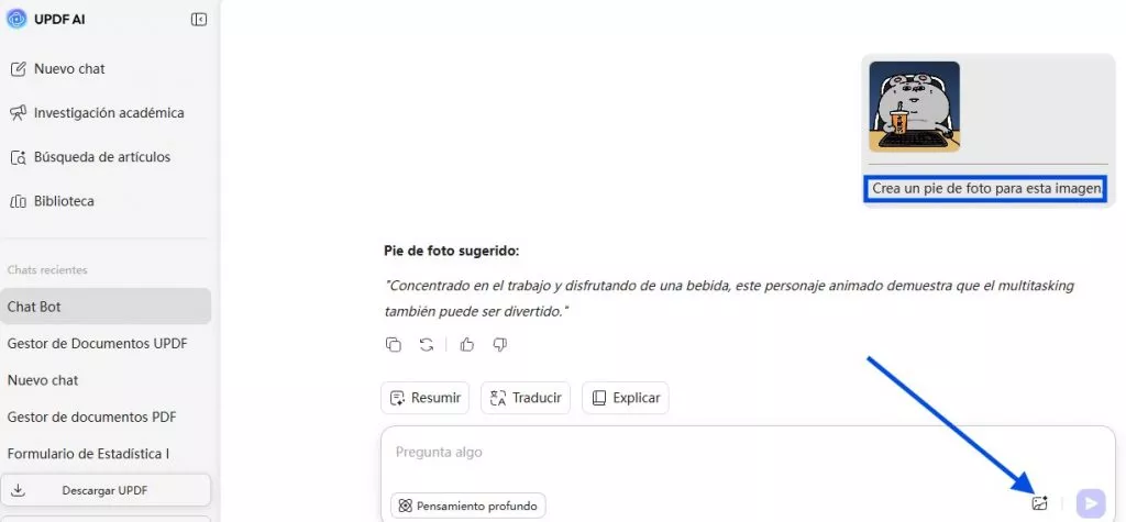 Para la web: Para que UPDF AI cree contenido a partir de una imagen, comience por cargar la imagen utilizando el icono «Imagen». Introduzca su texto (puede pedir que se escriban pies de foto para una imagen) para iniciar el chat, y la IA generará una respuesta. Puede copiar el resultado si se ajusta a sus necesidades, o solicitar una regeneración si desea un resultado diferente.