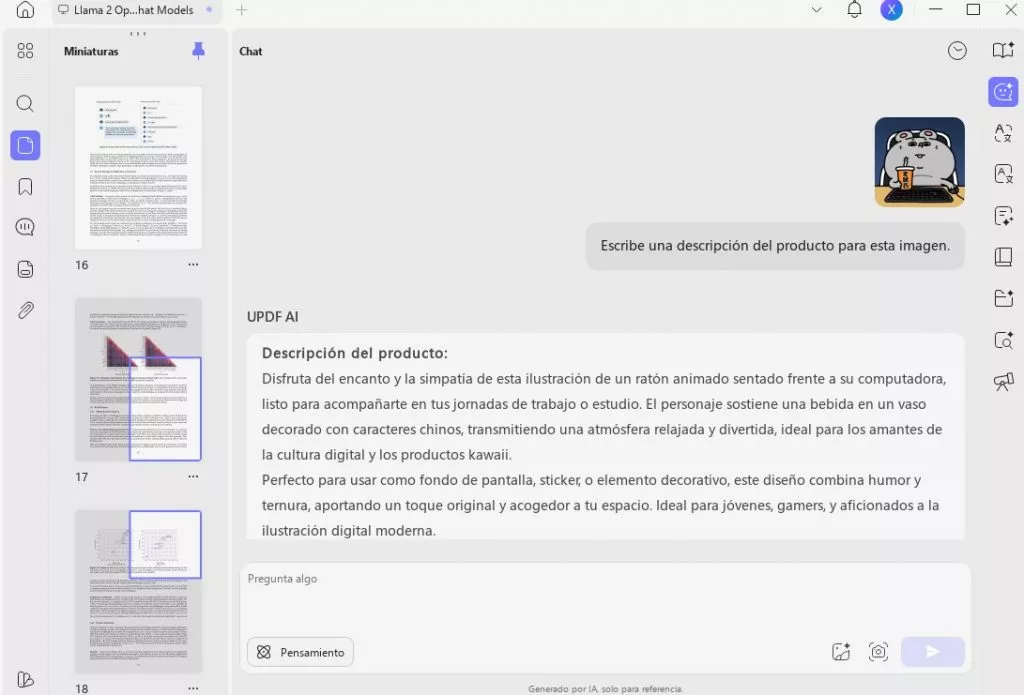 Para ordenadores de sobremesa: en la función «Chat», sube cualquier imagen e introduce la indicación pertinente. Por ejemplo, puedes dar la orden: «Escribe una descripción del producto para esta imagen». UPDF generará el contenido por ti. Si lo deseas, puedes «Copiarlo». De lo contrario, puedes hacer clic en «Regenerar» para generar otro.