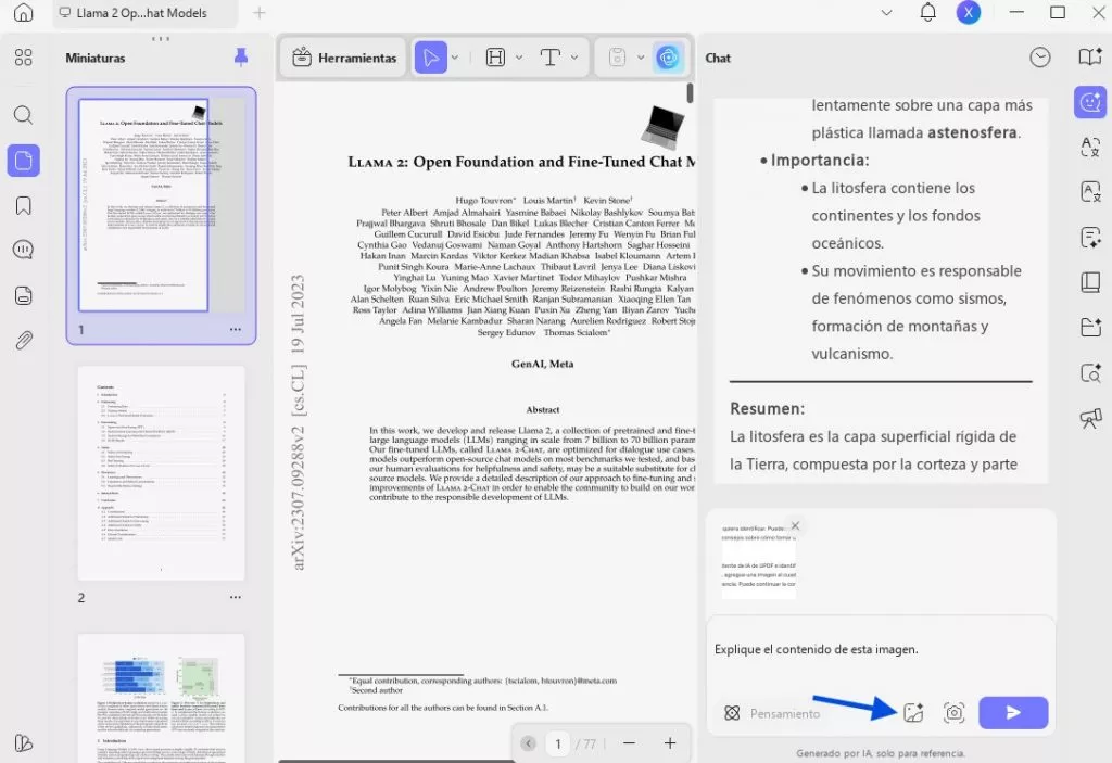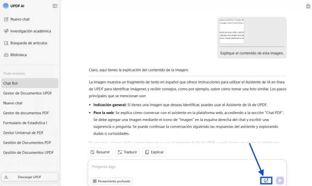 Para la web: Para conversar con el asistente de IA de UPDF e identificar y chatear sobre una imagen, debes acceder a la sección «Nuevo chat». A continuación, pulsa el icono «Imagen» para importar la imagen y escribe la indicación para que la IA identifique a la persona o cosa que aparece en la imagen. Puedes continuar la conversación en función de las respuestas y de tu curiosidad.