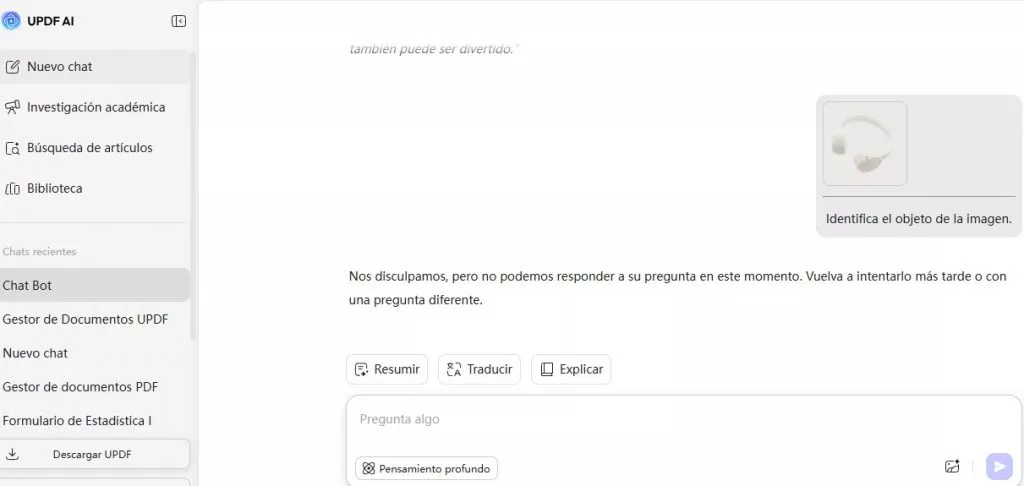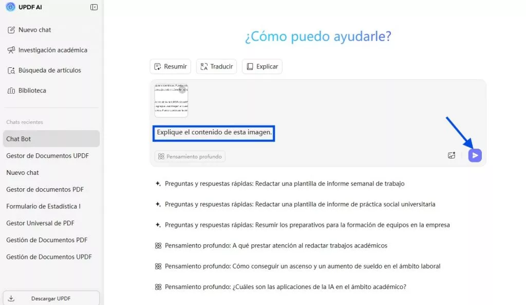 Es fácil de usar como cualquier Chatbot. No te preocupes por el coste, los primeros 30 prompts nos salen GRATIS y la versión de pago también es muy barata. Una vez que obtengas la suscripción, también puedes descargar la aplicación de escritorio UPDF haciendo clic en el botón de abajo, que te permitirá chatear con un PDF. Imagina la eficiencia te regalará en tu trabajo. Puedes probar a utilizar esta herramienta en línea ahora mismo con este enlace.