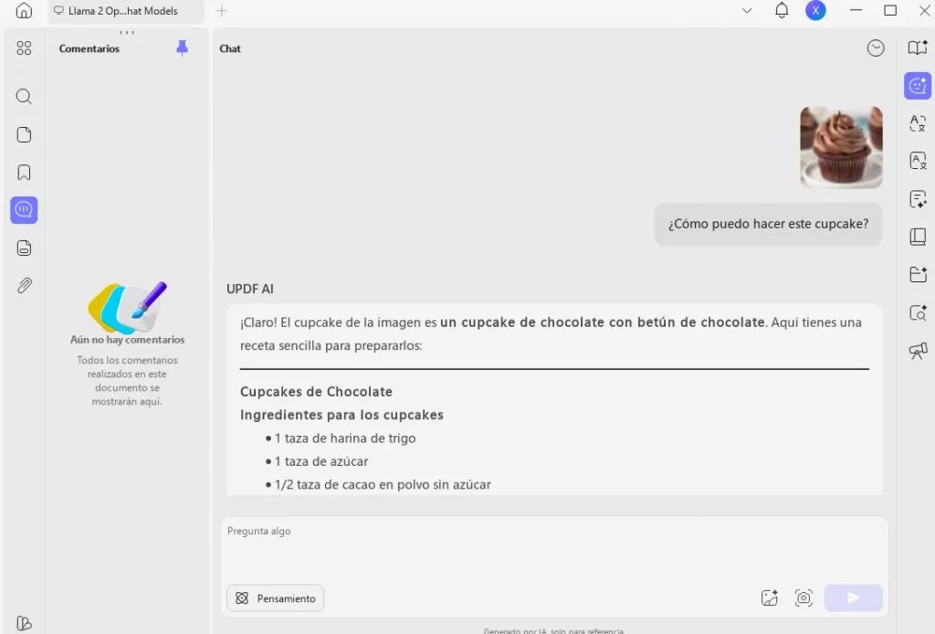 Para ordenadores de sobremesa: Ve a la función «Chat» en «IA». Sube la imagen haciendo clic en el icono «Imagen» del cuadro de diálogo. Introduce cualquier comando y habla con la IA de UPDF sobre la imagen. Por ejemplo: «¿Cómo puedo hacer este cupcake?».