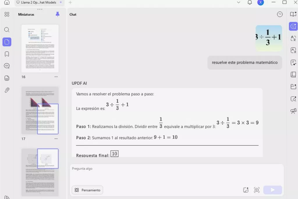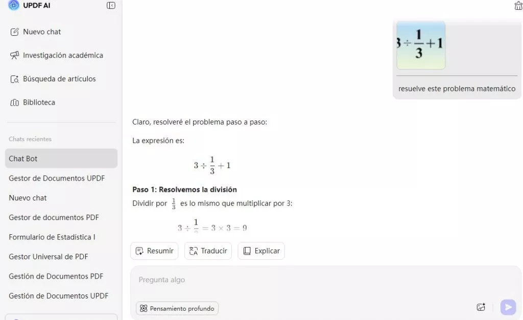 Para ordenadores de sobremesa: Sube la imagen del problema matemático tal y como hemos hecho en los pasos anteriores. Introduce un comando y pide al UPDF que lo resuelva, por ejemplo, «Resuelve este problema matemático».