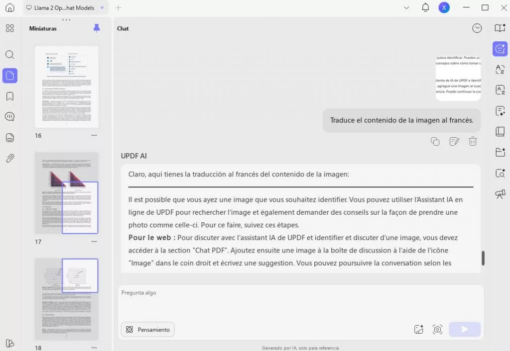 Para escritorio: Sube cualquier imagen que contenga texto y pide a la IA de UPDF que traduzca el texto al idioma que desees. Por ejemplo, «Traduce el texto de la imagen al chino».