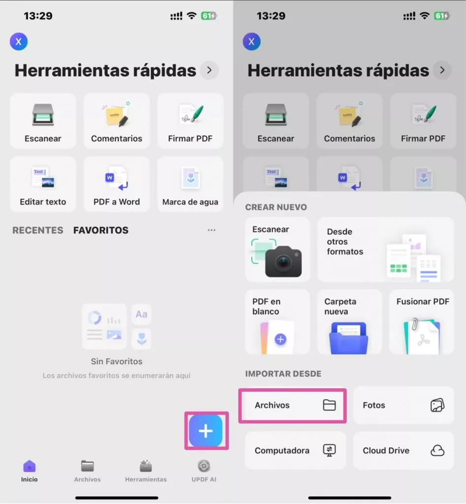- Ahora, pulse el icono Más en la pantalla principal y seleccione Archivos en la sección Importar desde para importar el PDF que desee.