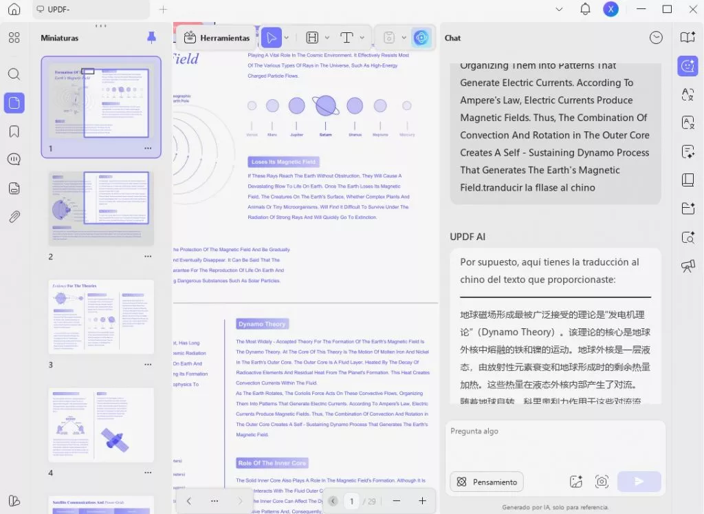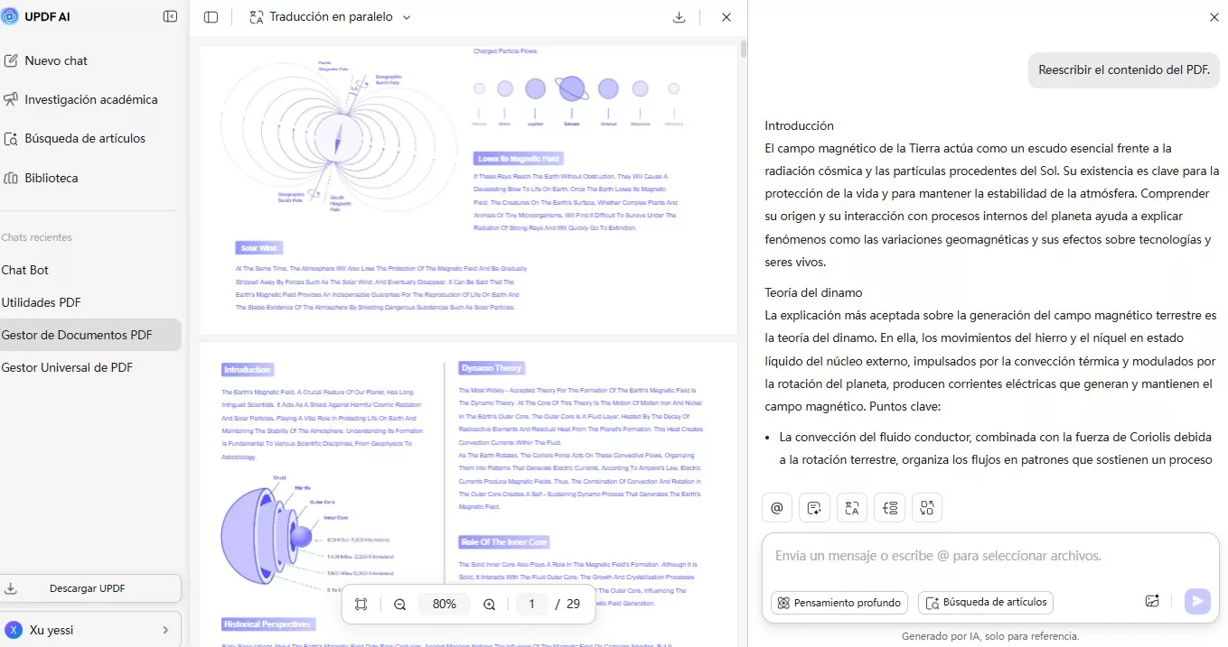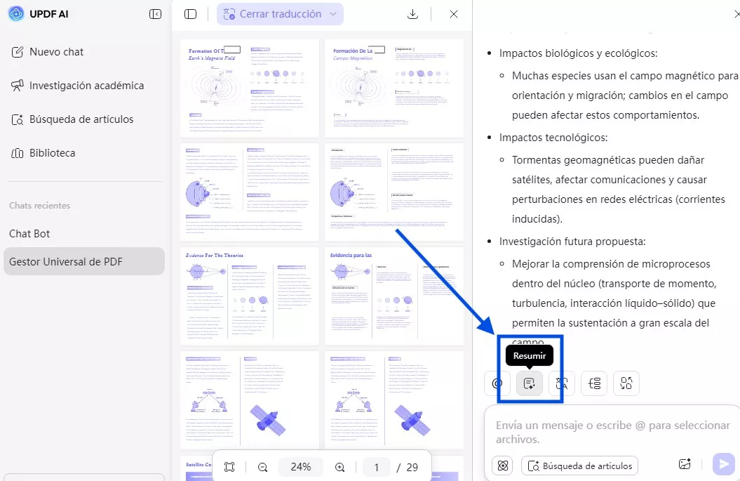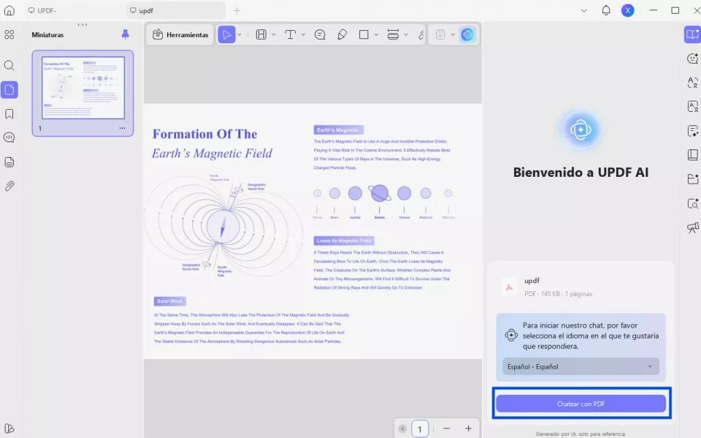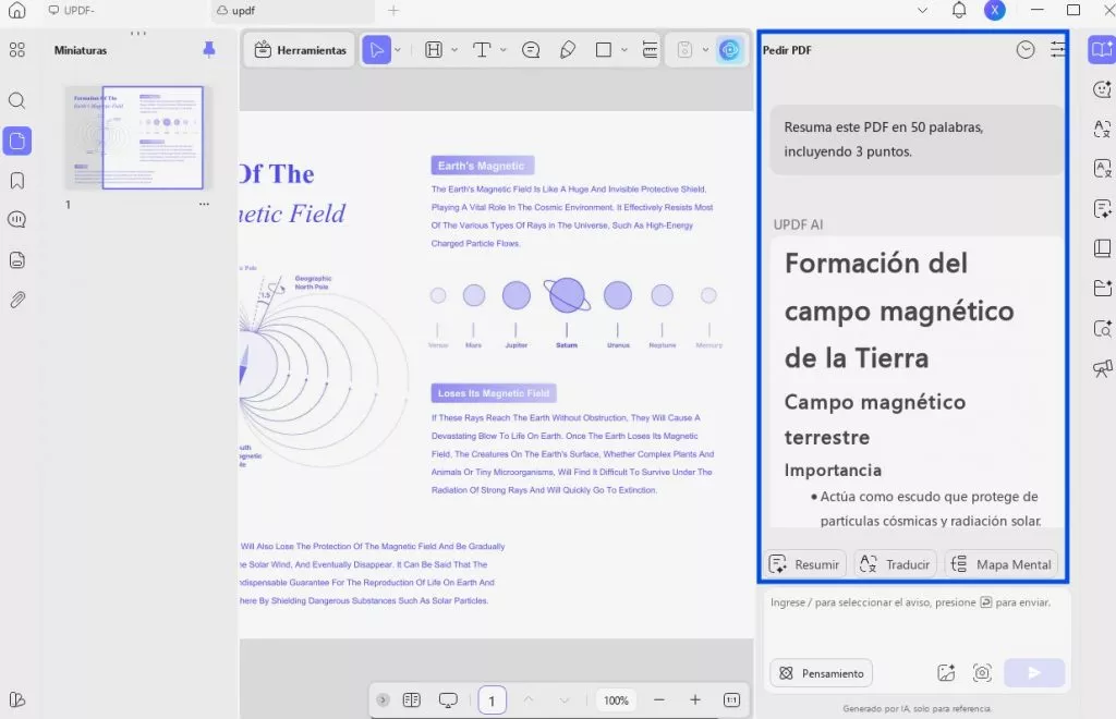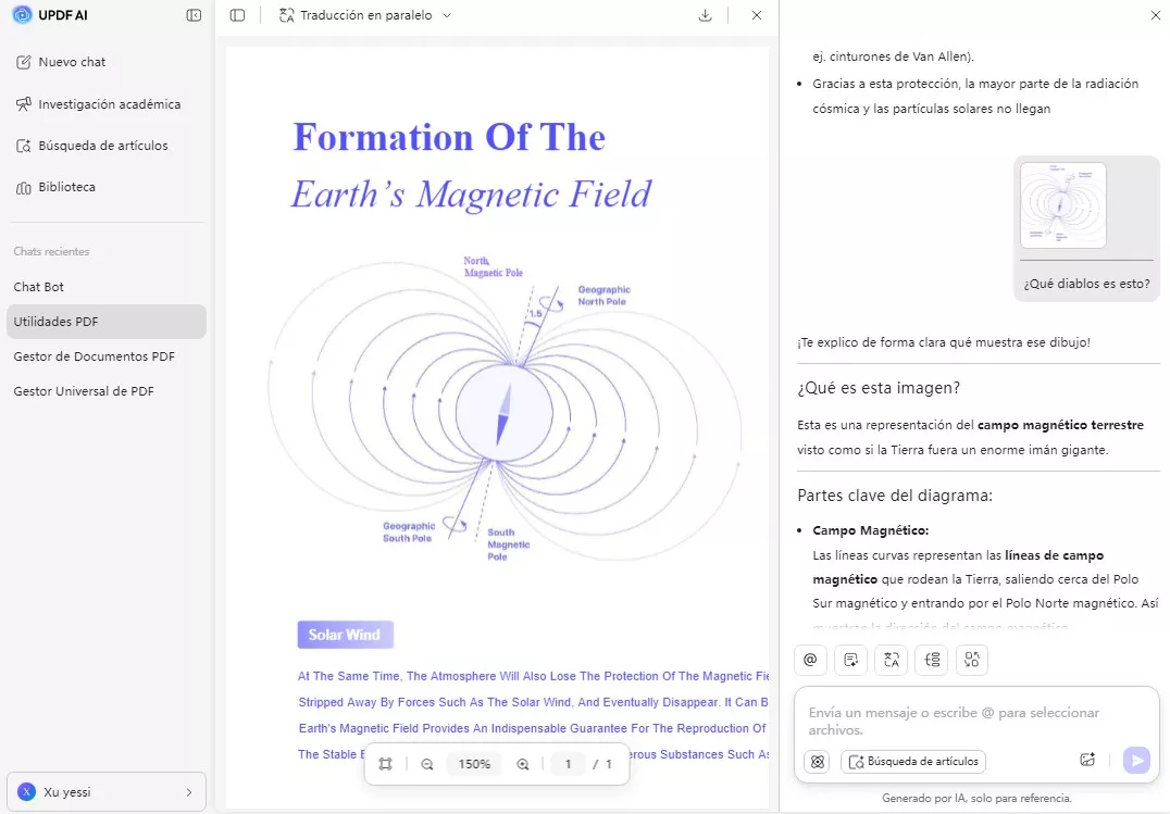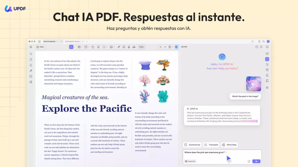 El asistente de IA de UPDF es un potente asistente de IA para PDF que te permite chatear con documentos PDF y extraer información clave fácilmente. Te puede ayudar a resumir, traducir y explicar el contenido de un PDF, o a hacer cualquier pregunta sobre el PDF. Lo mejor es que la función de IA de UPDF está disponible tanto en línea como en la aplicación.