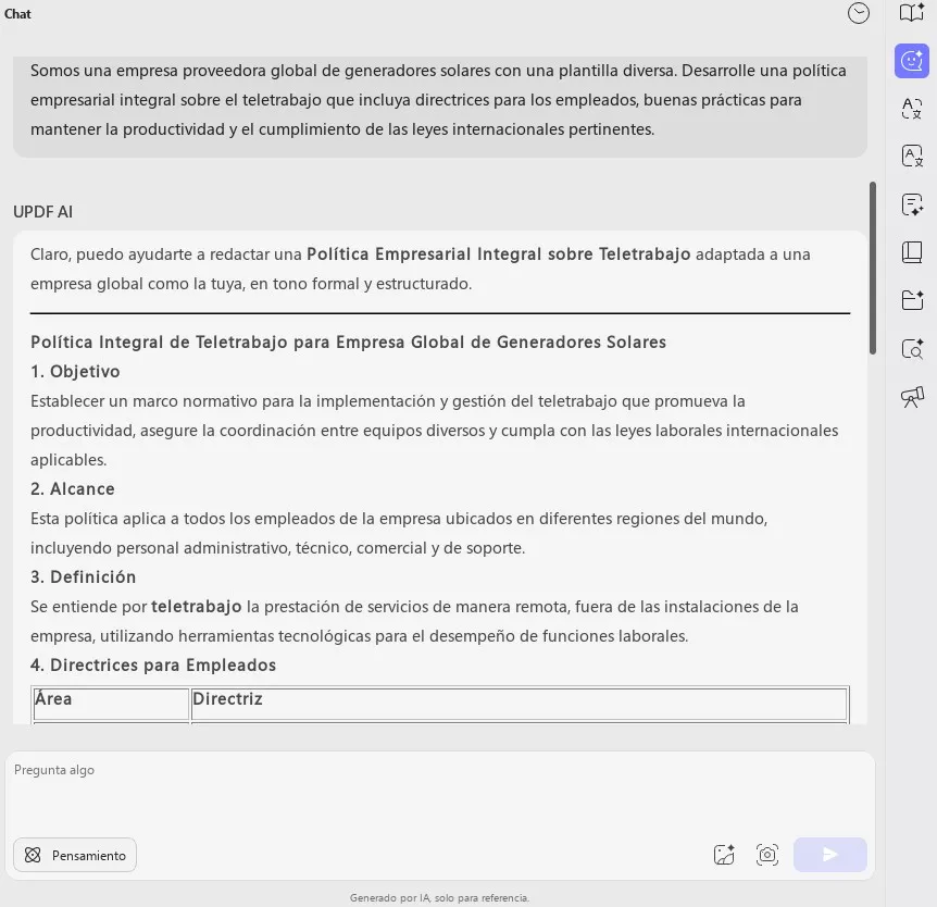 De igual manera, puedes usar el cuadro de chat para hacer preguntas relacionadas con el PDF, como: