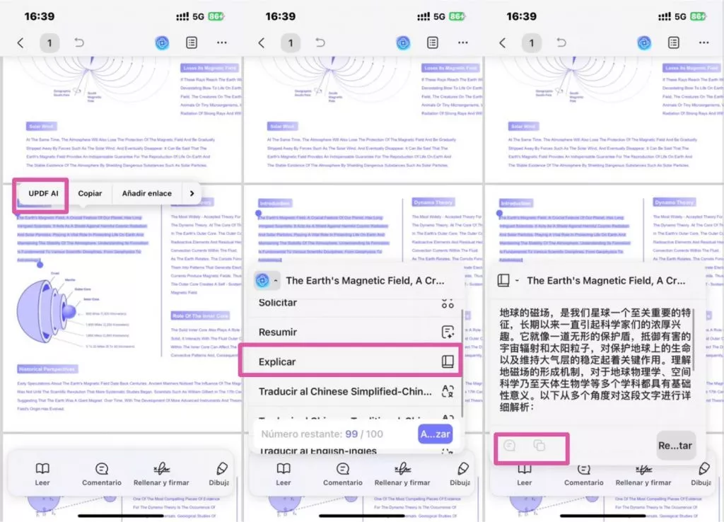 - En dispositivos móviles: después de importar el PDF, resalte el texto que desea aclarar y seleccione UPDF AI en la barra de herramientas flotante. Elija la opción Explicar y la herramienta generará una explicación detallada. Una vez lista, toque el icono Copiar o Nota para añadir la explicación directamente a su PDF.