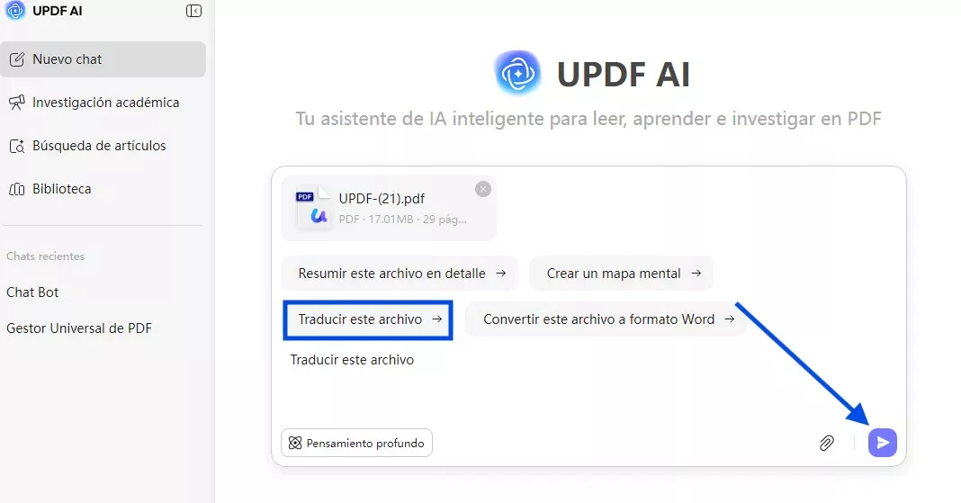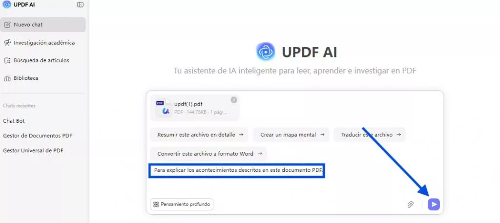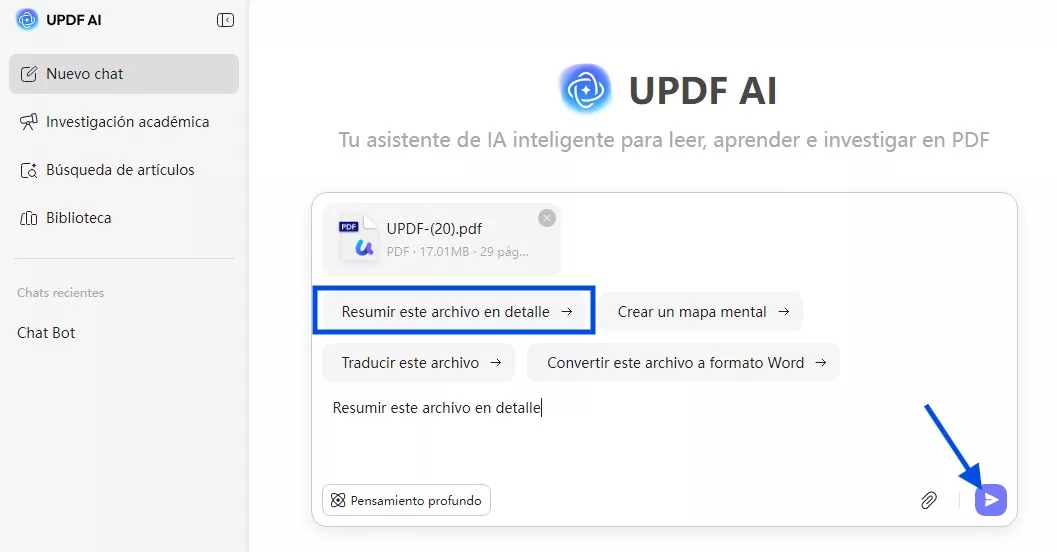Después de cargar el PDF en la interfaz de UPDF Chat PDF, introduzca su mensaje en el cuadro de texto o pulse el mensaje «Resumir este archivo en detalle» y haga clic en «Enviar» para continuar.