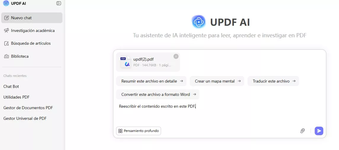 De esta manera, solo tienes que subir cualquier PDF y pedirle a un asistente de IA que reescriba el contenido.