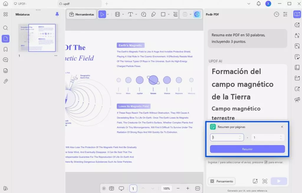 UPDF AI permite a los usuarios resumir el contenido de los archivos PDF cargados mediante comandos (prompts) o resaltando rangos de páginas específicos. Aquí tienes los pasos que puedes seguir para resumir el texto de un PDF de dos maneras: