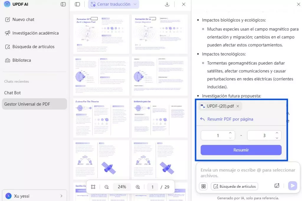 - Resuma todo el PDF o páginas o contenidos específicos del PDF.