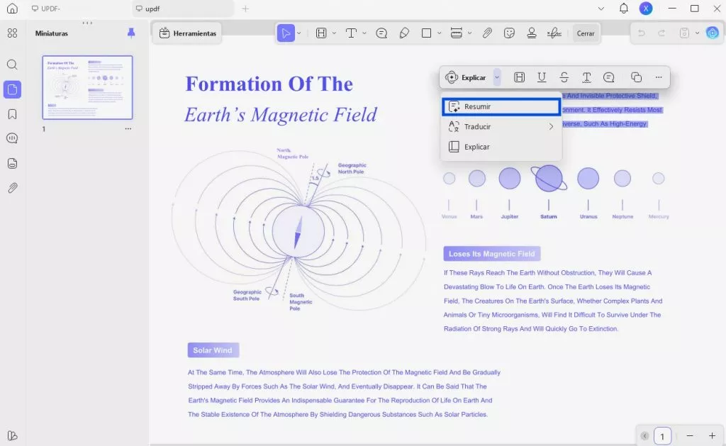 Con el asistente de IA de la aplicación de UPDF, puedes resumir, traducir, explicar, reescribir, idear y mucho más con tus PDFs. Para acceder al asistente de IA de UPDF en la aplicación: