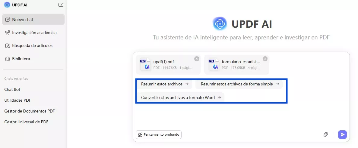 En adelante, podrás obtener fácilmente los resúmenes, la traducción y la explicación de todos estos archivos a la vez. Además, incluso podrás chatear con todos los PDF cargados a la vez para ahorrar tiempo y mejorar la productividad.
