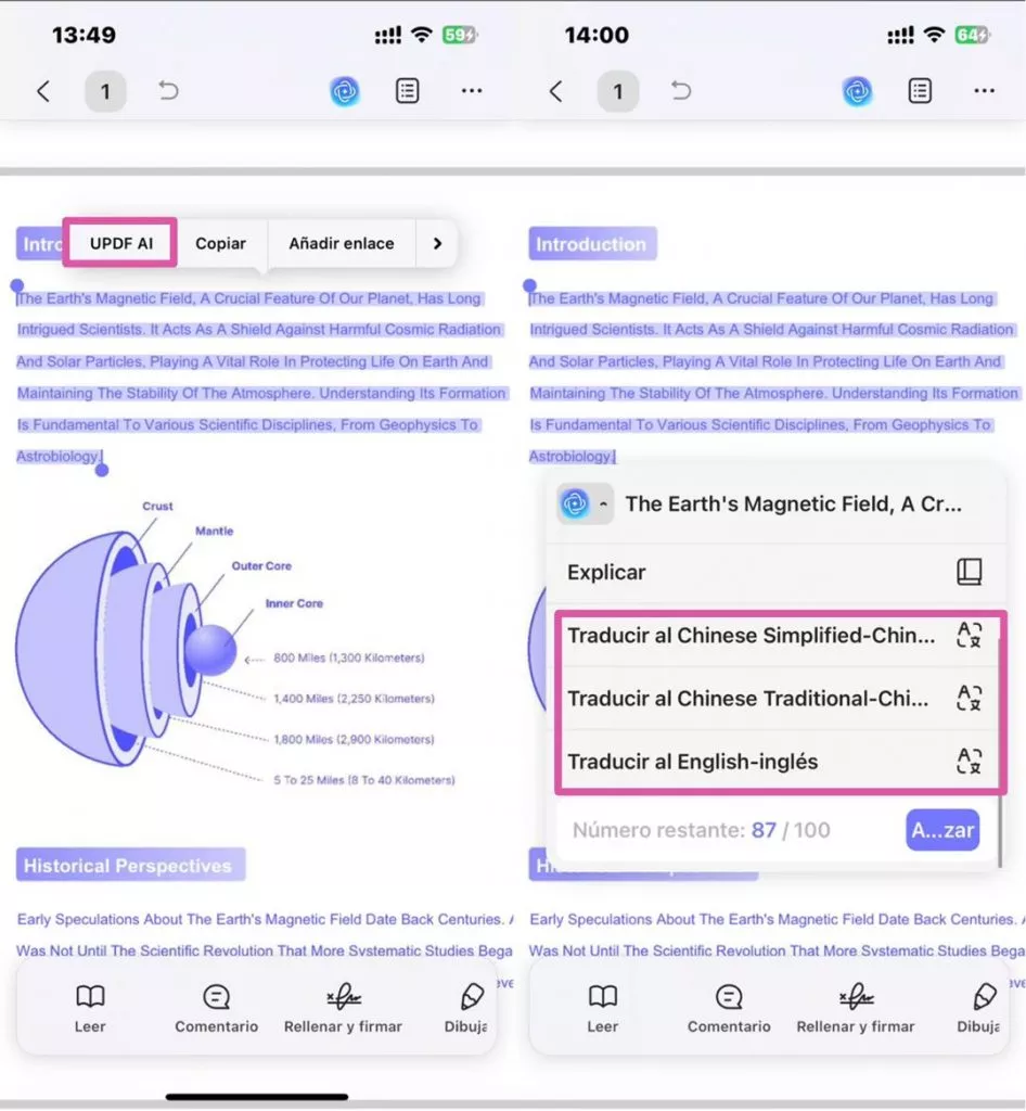 - En dispositivos móviles: con el PDF abierto en la aplicación, resalte el texto que desea traducir y pulse UPDF AI en el menú emergente. A continuación, seleccione «Traducir a...» y elija el idioma que prefiera. Revise el resultado traducido y continúe según si cumple con sus requisitos de precisión.