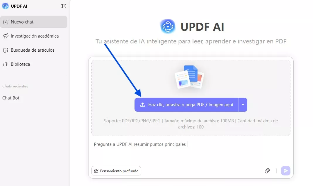 Paso 1: Subir o arrastrar archivo a UPDF AI Chat PDF