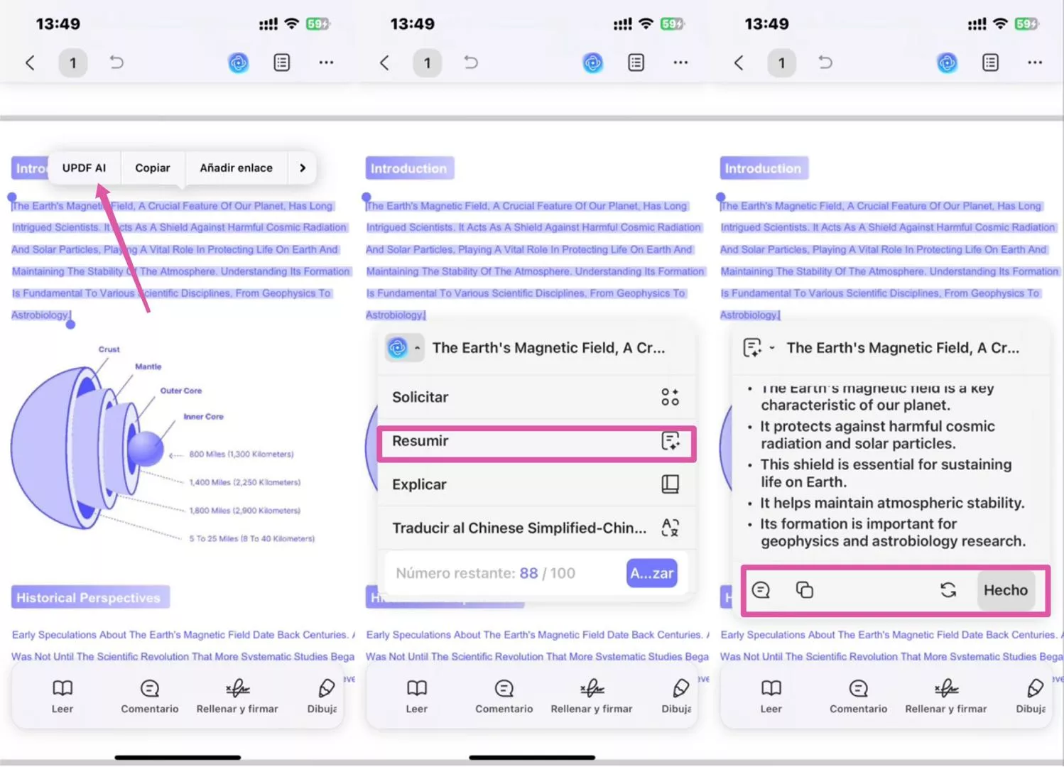 - En dispositivos móviles: Comience abriendo el PDF en la aplicación y resalte el párrafo o la línea que desea acortar. Aparecerá un menú emergente en el que deberá pulsar UPDF AI y seleccionar Resumir en el menú. La aplicación generará al instante un resumen conciso que podrá copiar, pegar y leer rápidamente para facilitar su comprensión.