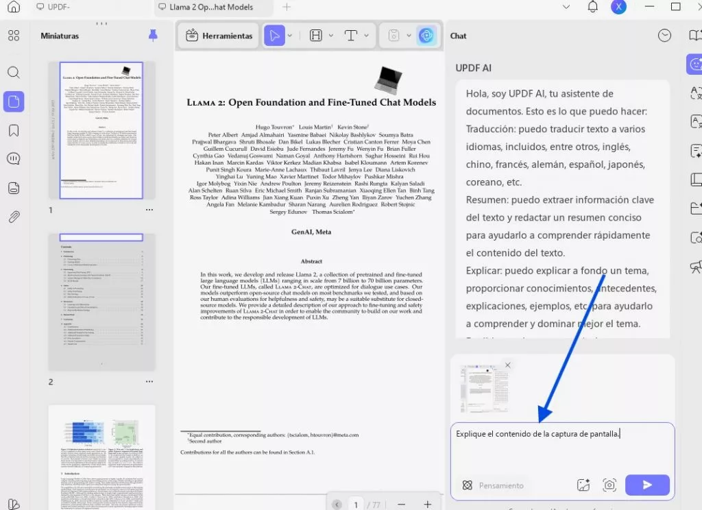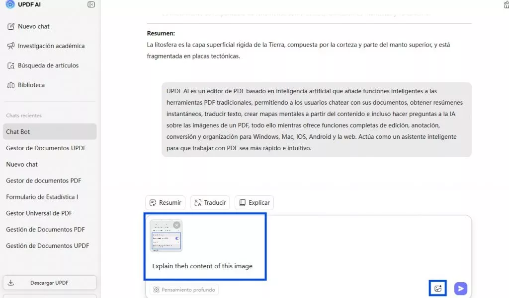 Los usuarios pueden incluso añadir capturas de pantalla para que UPDF AI les explique el contenido. Para ello, basta con pulsar el icono de imagen en el cuadro de texto. A continuación, solicite a la IA que explique el contenido de la imagen y pulse el icono Enviar.