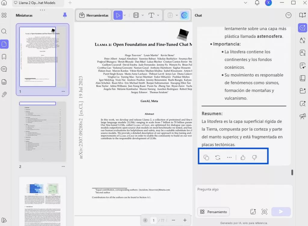 Paso 3. Una vez generada la explicación, solo tienes que pulsar el icono Copiar para pegarla en otro lugar. Además, puedes utilizar la función Notas y resaltado para incorporar esta explicación a tu PDF.