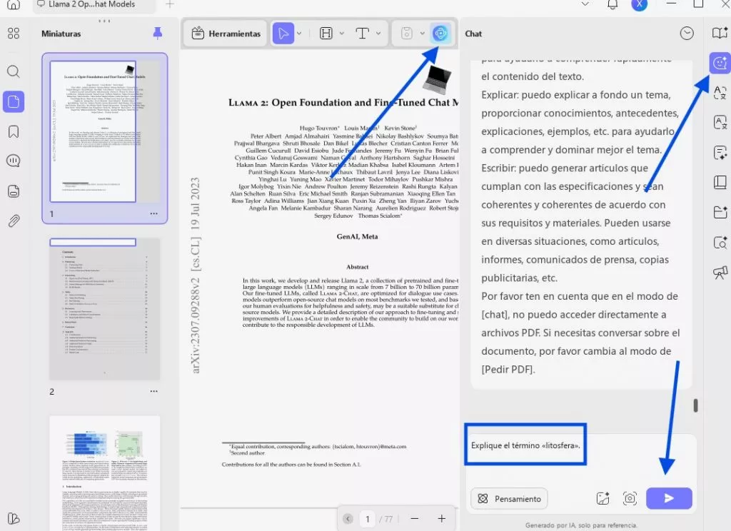 Paso 1. Después de cargar el PDF, toque el icono de UPDF AI en la parte superior derecha de la pantalla. En la nueva ventana lateral, acceda al modo de chat y escriba la solicitud para explicar el término o la frase que desee. A continuación, pulse el icono Enviar para obtener la explicación detallada.