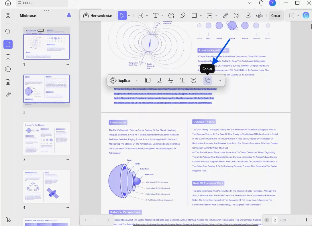 Paso 1. Al importar el PDF a UPDF, seleccione el texto que desea explicar y pulse el icono Copiar en la caja de herramientas flotante.