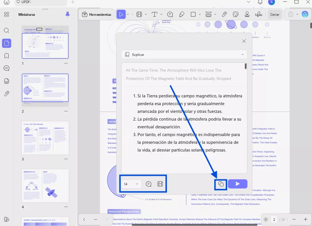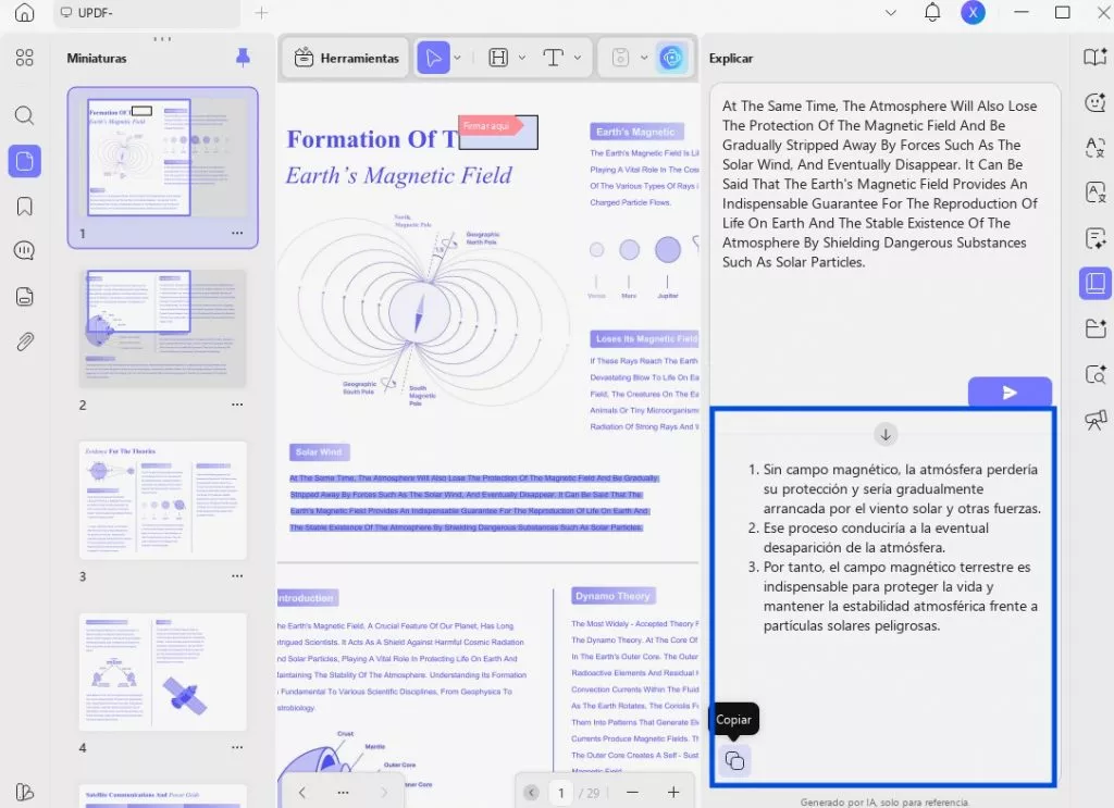Los usuarios solo tienen que seleccionar el contenido y utilizar la función de explicación de UPDF AI para recibir información instantánea. Después de recibir una explicación, también tienen la opción de copiarla y regenerarla.
