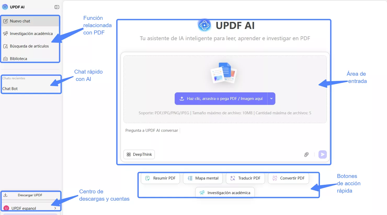 Con la función Chat con PDF de UPDF, puedes interactuar con tus documentos de una forma más productiva. Te permite hacer preguntas, resumir, traducir, explicar o convertir archivos PDF en mapas mentales, todo desde una sola interfaz. En la versión en línea, puedes subir un solo PDF o varios PDF y empezar a chatear de inmediato. La IA entiende documentos en cualquier idioma y responde en tu idioma preferido. También puedes analizar tablas, gráficos y datos estructurados directamente.