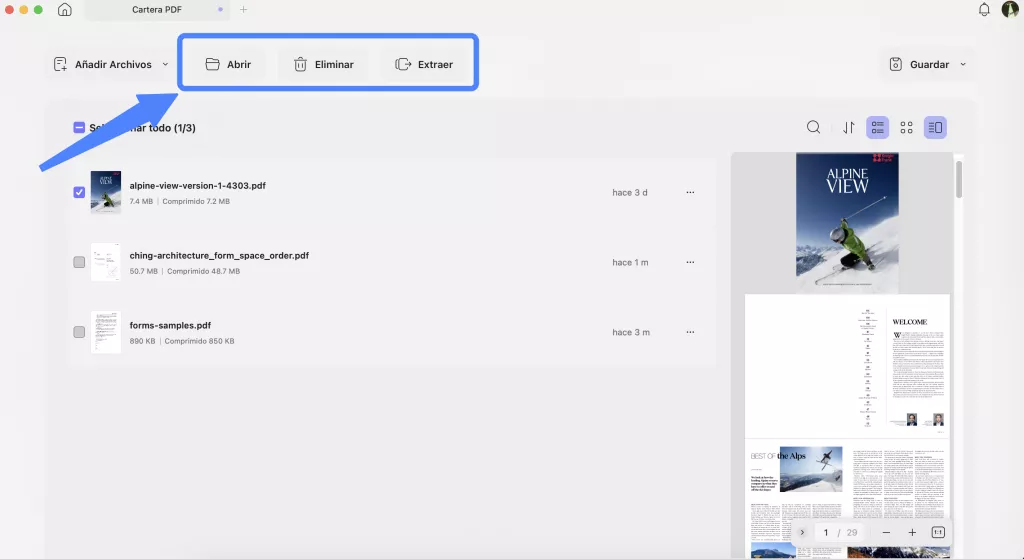 Puede seleccionar archivos específicos para abrir, eliminar y extraer según sea necesario antes de almacenar su carpeta PDF.
