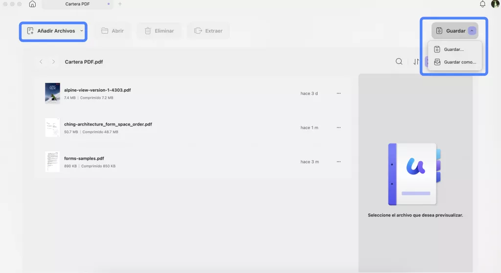 En la interfaz del portafolio PDF, haga clic en el botón "+ Añadir archivos" situado en la parte izquierda de la barra de herramientas. Seleccione los archivos que desea incluir. A continuación, haga clic en Guardar para finalizar y almacenar su portafolio PDF.