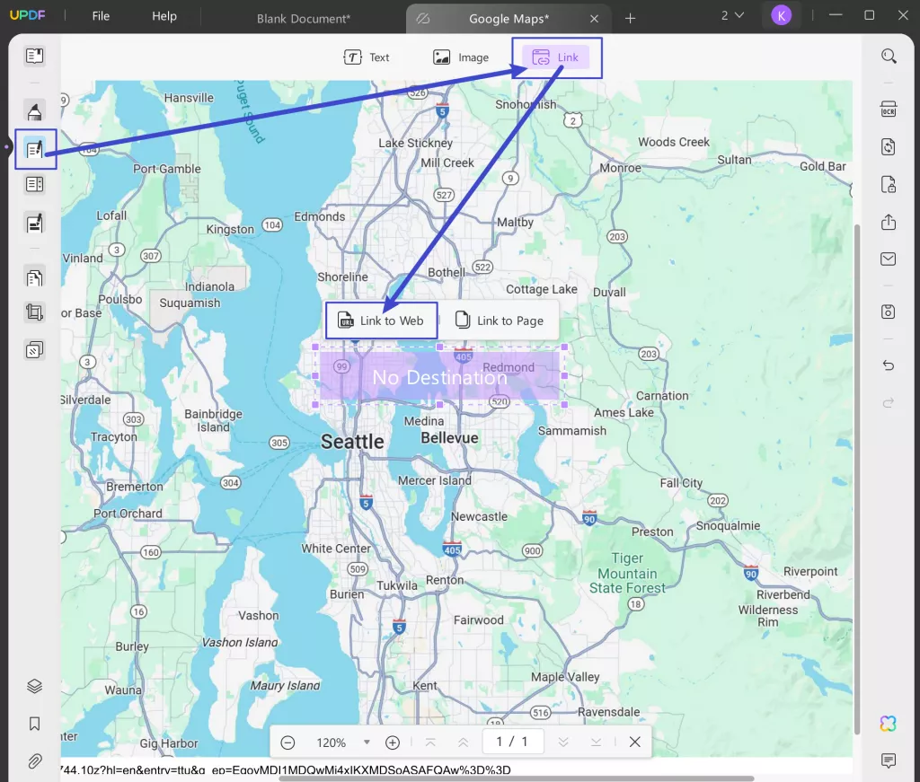 Si vous craignez que les cartes téléchargées ne soient pas suffisantes, vous pouvez intégrer des liens Google Maps directement dans vos PDFs. Cela vous permet d'accéder à des cartes plus complètes chaque fois que la connexion Internet est disponible. L'intégration d'URLs dans UPDF est incroyablement simple—suivez simplement ces étapes :