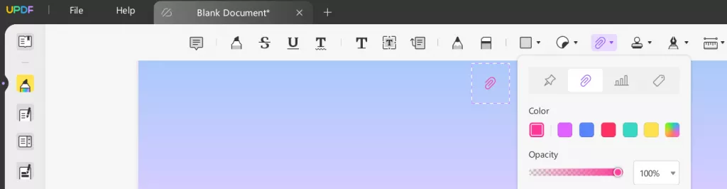 Une fois le PDF ouvert dans UPDF, cliquez sur « Commentaire » dans la barre latérale gauche pour accéder aux fonctionnalités de commentaire d'UPDF. Trouvez le bouton « Joindre un fichier » dans la barre de menu en haut, qui contient toutes les options de commentaire. Après avoir sélectionné cet outil, cliquez à l'endroit de votre fichier PDF où vous souhaitez ajouter l'autre PDF. En cliquant, le gestionnaire de fichiers s'ouvrira, vous permettant de sélectionner le deuxième fichier PDF à ajouter en tant que pièce jointe.