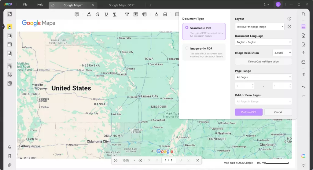 Par exemple, après avoir téléchargé un fichier carte en PDF, vous voudrez peut-être créer un guide de voyage sur ce fichier. Vous pouvez ouvrir le fichier avec UPDF, cliquer sur la fonction « Effectuer OCR » dans la barre d'outils à droite pour convertir le fichier en une version modifiable, puis annoter votre carte. Les fonctionnalités incluent, mais ne sont pas limitées à, l'annotation, les commentaires et la prise de notes sur les fichiers PDF.