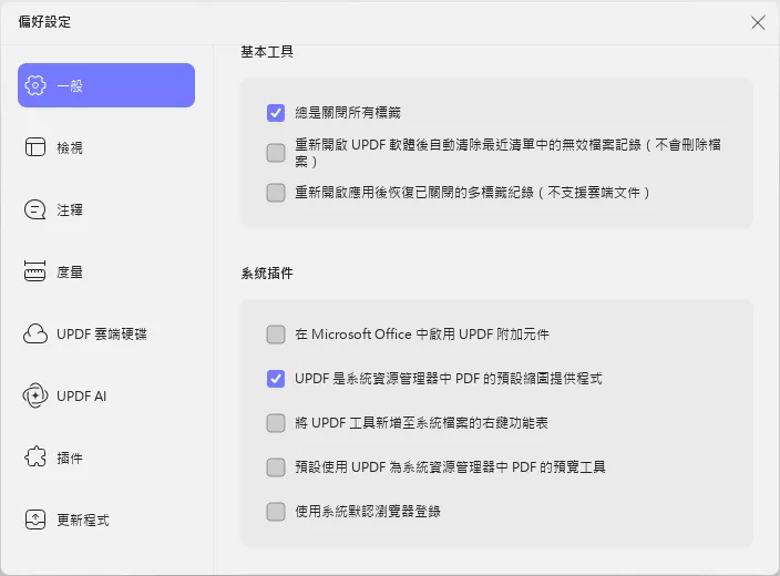 步驟3.點擊“常規”,向下捲動找到「系統外掛程式」並選取「UPDF 是系统资源管理器中 PDF的预設缩固提供程式」。接著,關閉 UPDF 軟件。
