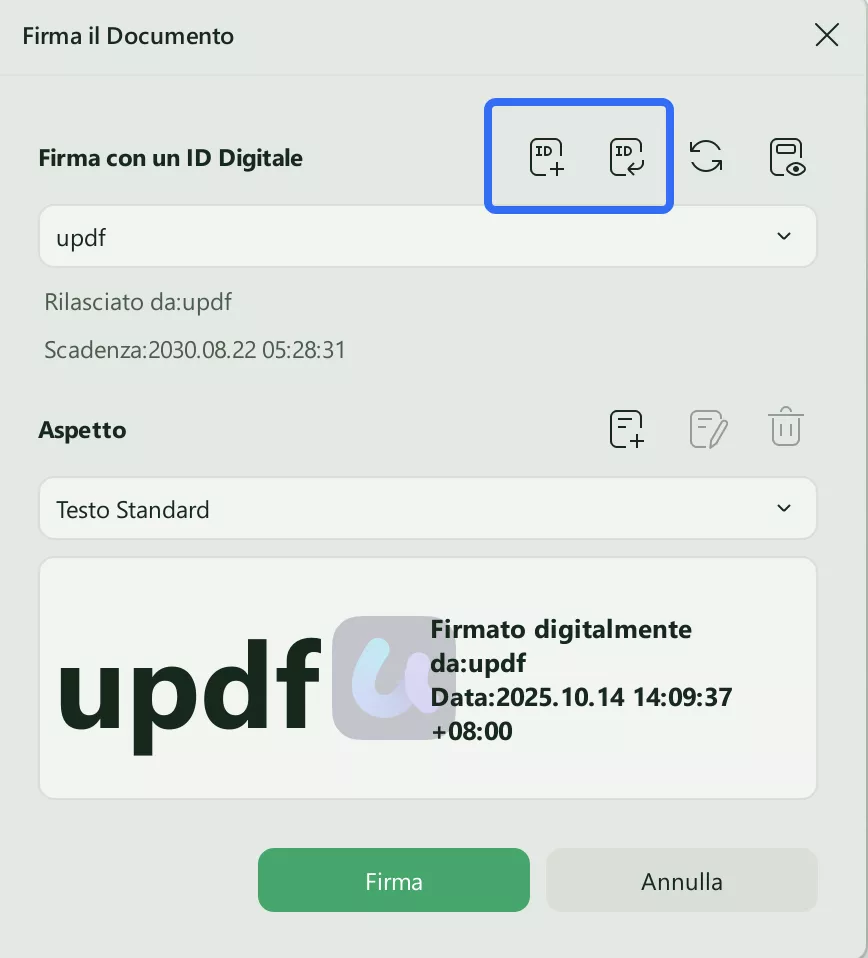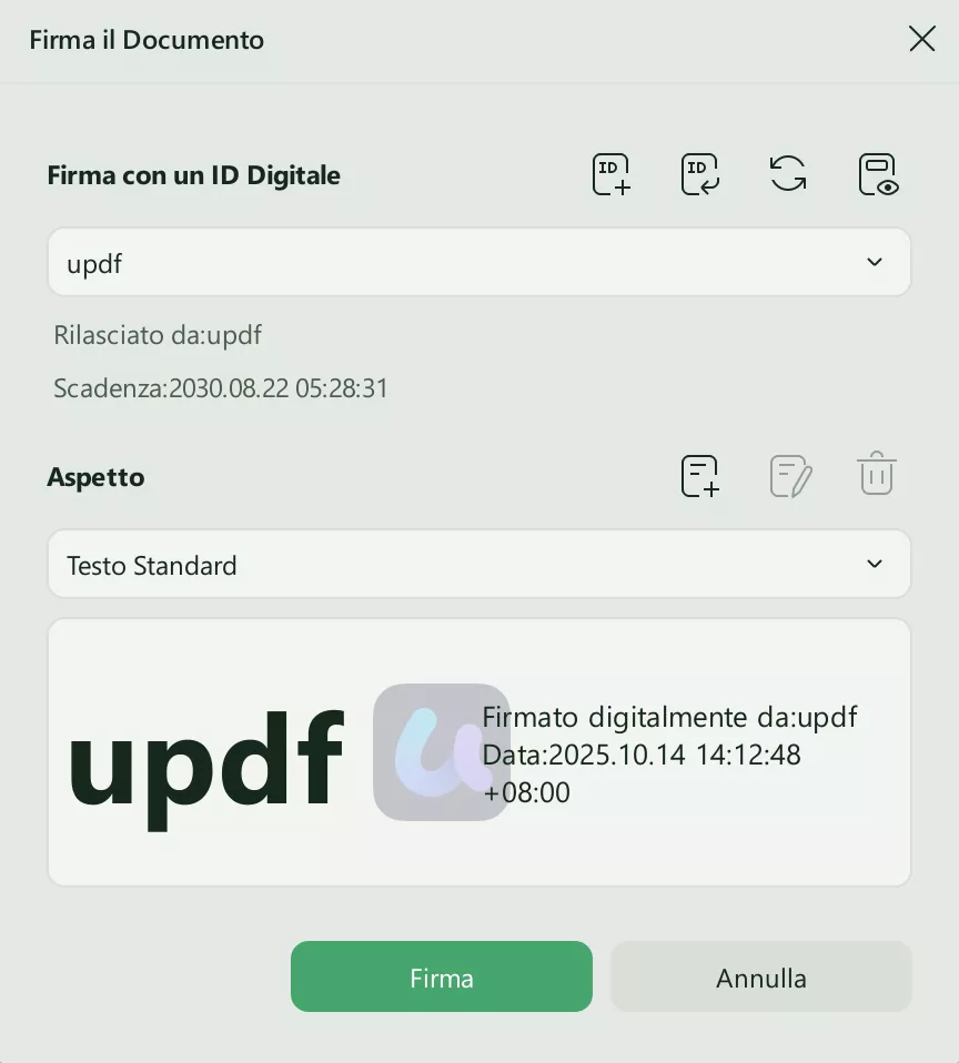 Nota importante: UPDF supporta sia le firme digitali che quelle elettroniche. Gli utenti possono aggiungere qualsiasi tipo di firma selezionando la modalità corrispondente: "Annota" e "Prepara modulo".