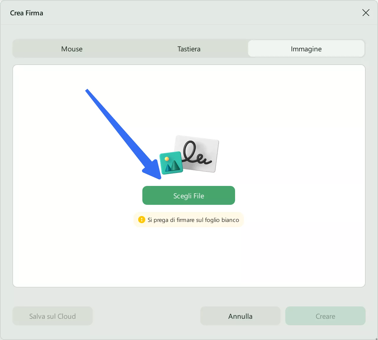 Un modo alternativo è quello di importare la firma cliccando sul pulsante Importa anziché su Crea.