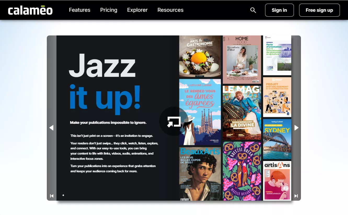 Calameo is an online platform that allows users to turn their regular files into flipbooks. You upload a file; It could be a PDF, Word doc, PowerPoint, or even a text file, and this online platform will convert it into a digital magazine. You can easily flip through the pages. Everything is automated, no need for manual edits.