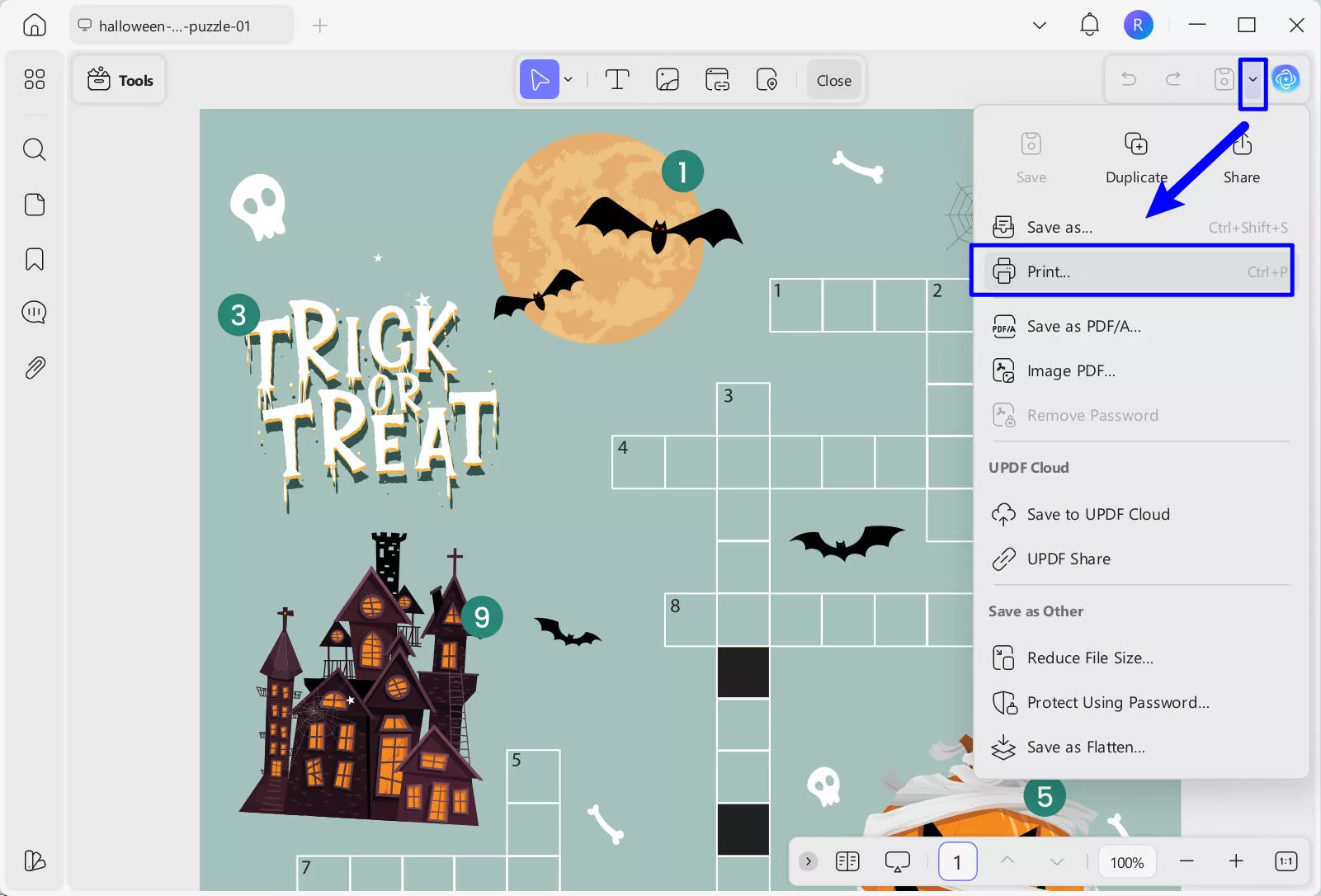 Do you want printable Halloween crossword puzzles? UPDF offers an easy option to print the crossword puzzle in the desired settings. Before printing the crossword, you can adjust page orientation and size. You can also specify the number of pages to print from the settings.