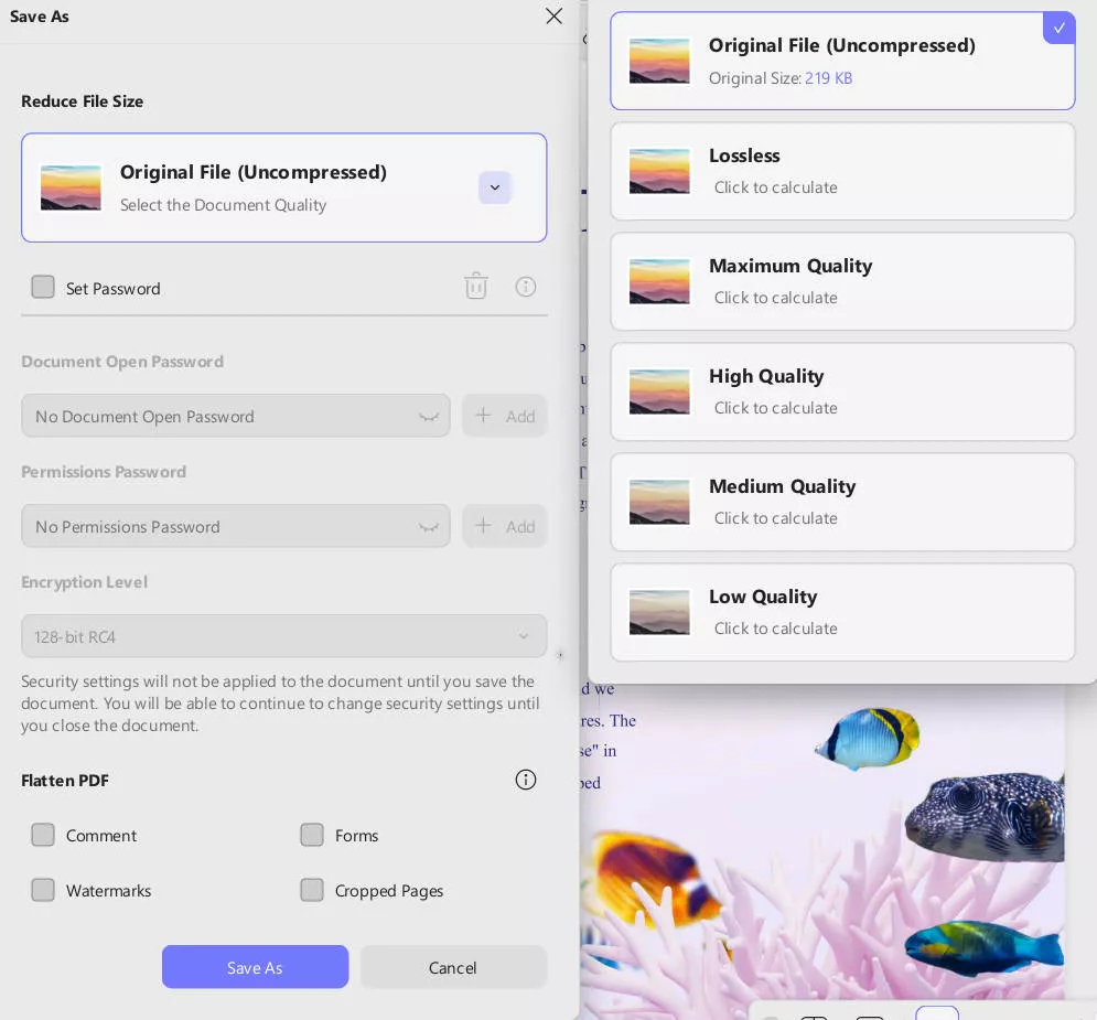 Step 2: Select your desired document quality and click "Save As". Now, follow the on-screen steps to save the compressed file on your computer.