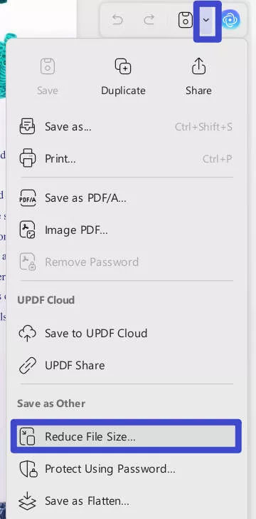 Step 1: Run UPDF software and navigate to the right-hand side and access the menu for the drop-down arrow next to the Save icon. A menu will appear, which will offer multiple options. From the available options, select Reduce File Size… to continue.