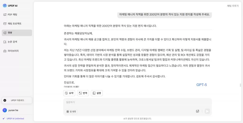 UPDF AI는 문서 워크플로우를 계속 관리하지만, 그 기반이 되는 인텔리전스는 훨씬 더 강력하고 안정적입니다. GPT-5가 이 업그레이드를 지원합니다. 인터페이스는 변경되지 않았지만 모든 기능이 더욱 스마트해졌습니다.