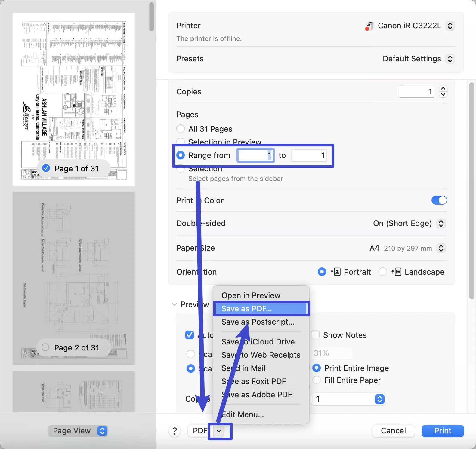 Step 3: Once you set the range of pages, click on the "Arrow Down" icon behind the "PDF". From the drop-down menu, select "Save as PDF". Next, click on the "Save" button to extract pages from the PDF to your Mac.