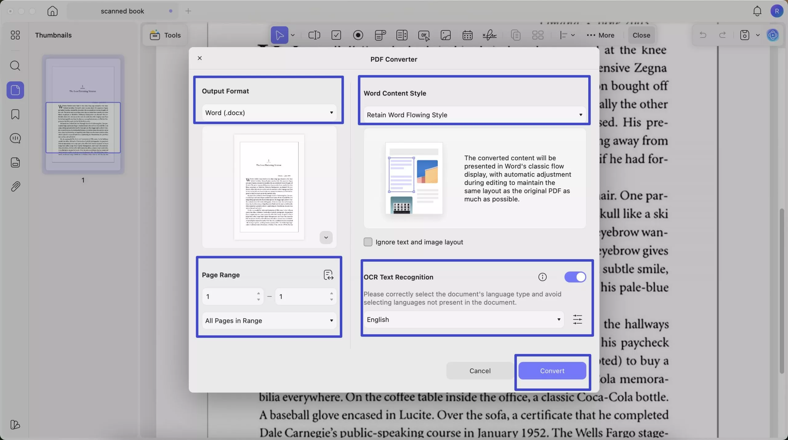 Step 3. From the pop-up window, check if have selected the right output format. You can set page range and content style if you choose Word as your output format. Toggle "OCR Text Recognition" to on and correctly select the documents' language type. Click the purple "Apply" button (bottom-right) to start conversion.