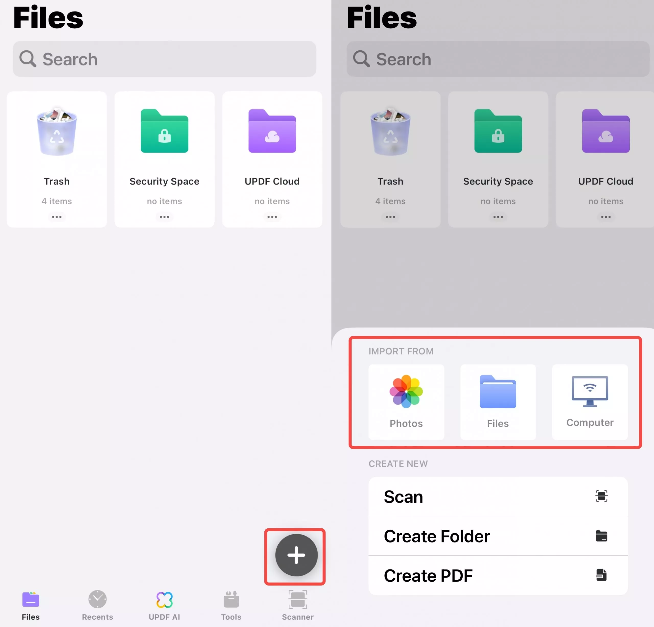 Step-2. Import the image files on your phone by tapping the "Plus" circle button on the bottom right. This will let you browse and add the files to the UPDF app folder.