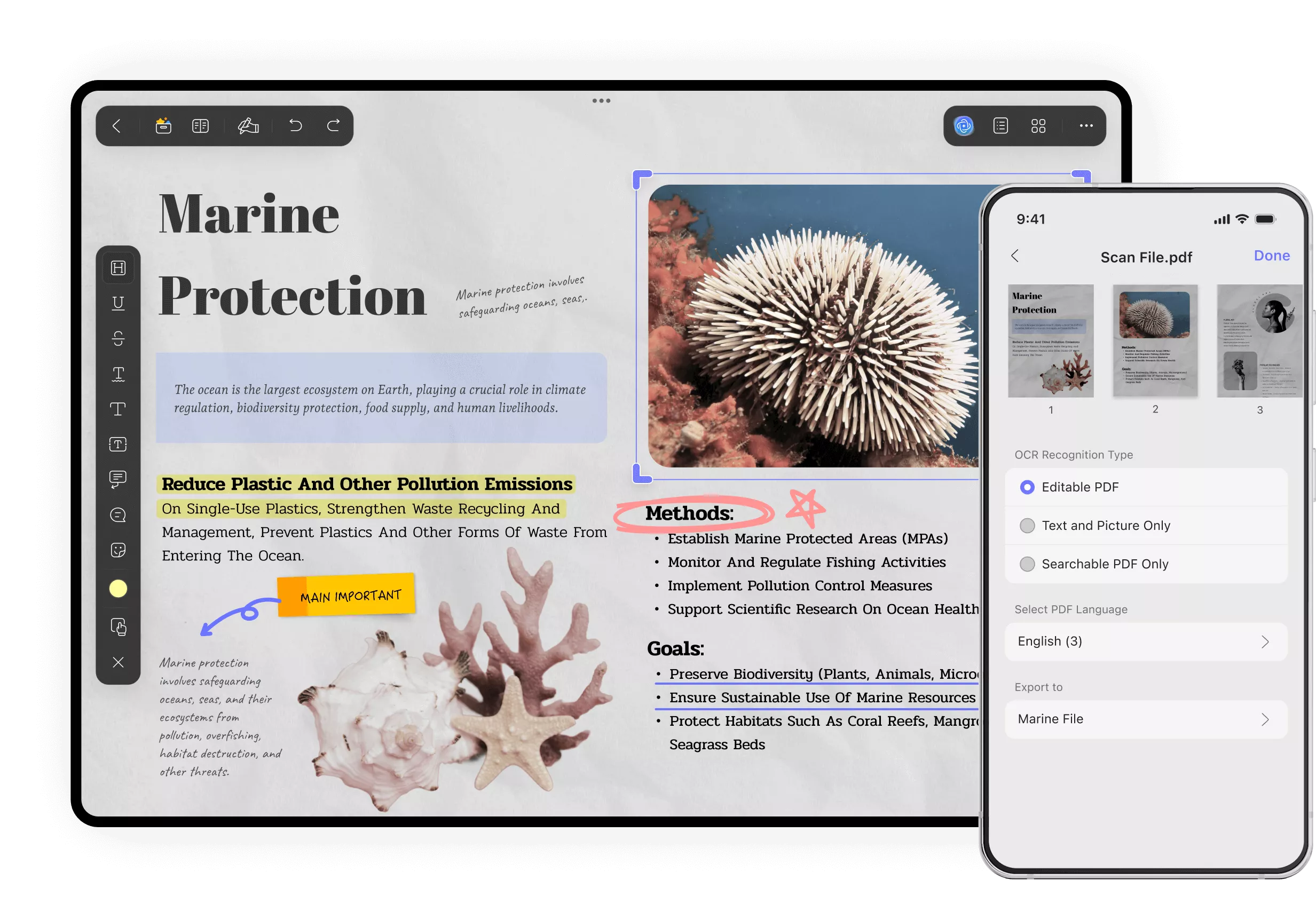- OCR Support: Make scanned PDFs searchable and editable in over 38 languages.