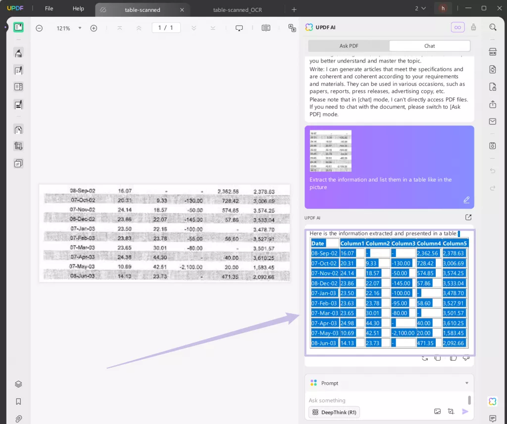 If you find the scanned table is blurry and the result is not accurate, you can use UPDF's AI assistant to convert scanned PDF to Excel. Here is the guide.