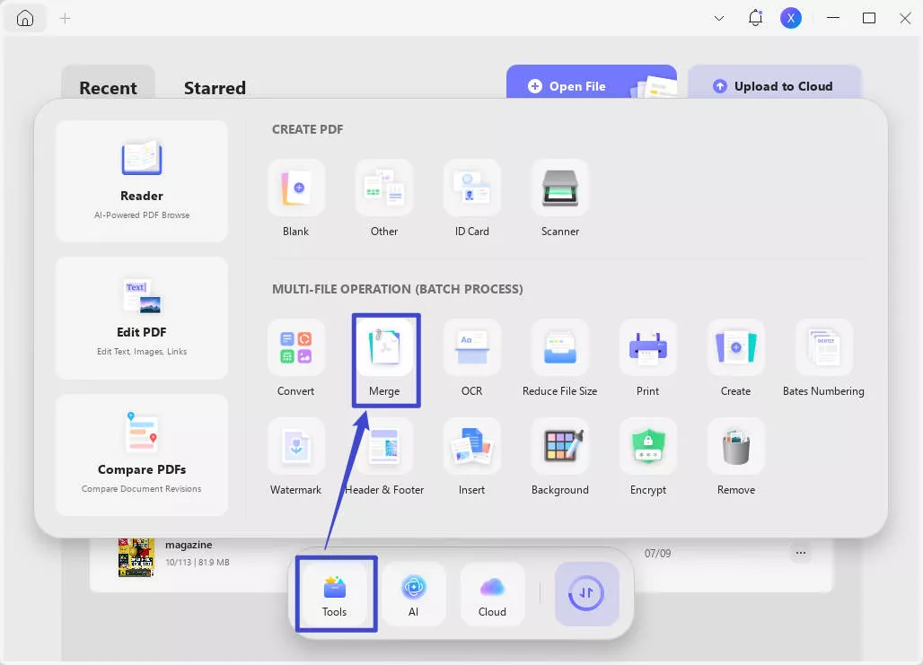 Step 2. Open the software, navigate to the "Merge" in "Tools".